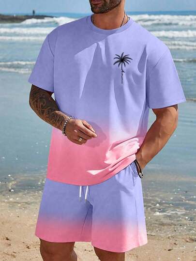 EASEVO Conjunto de camiseta de punto degradada y pantalones cortos casuales talla grande para hombre, apto para el verano - Azul menta - Añade 1