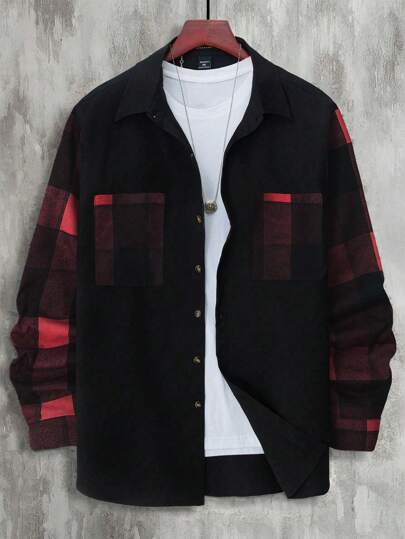 Manfinity Homme Camisa de manga larga a cuadros de patchwork informal para hombre de talla grande - Rojo - Añade 3