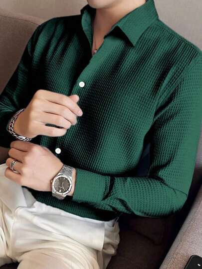 Camisa casual de manga larga con cuello abotonado y tejido de gofre para hombres de talla grande - Verde - Añade 1