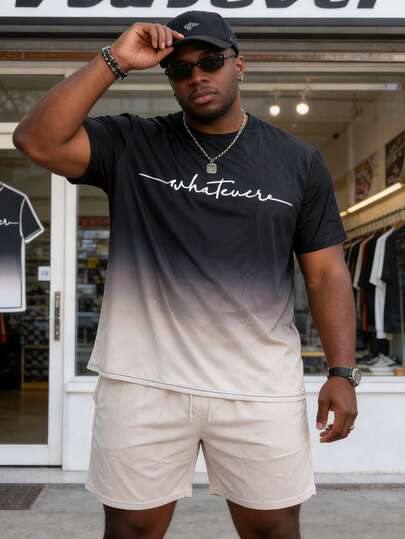 Conjunto de chándal informal con estampado de letras pequeñas degradado para hombre de talla grande, conjunto de sudadera de cuello redondo de manga corta con cordón, ropa de calle de estilo hip hop para verano, conjunto de ropa deportiva 100% poliéster - Multicolor - Añade 1