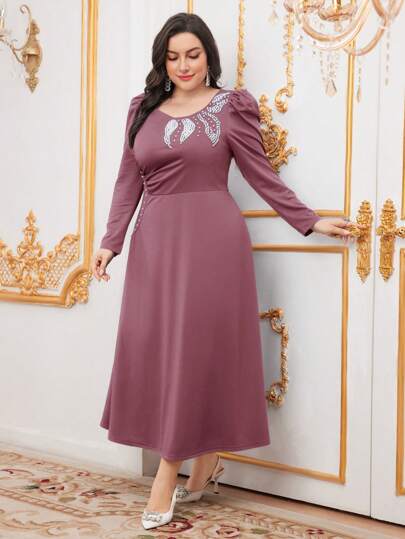 Modelyn Vestido De Talla Grande Con Cuello Falso De Piel De Oveja Y Mangas De Pierna Con Decoraciones De Perlas Falsas - Rosa vieja - Añade 5