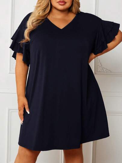 SHEIN CURVE+ Vestido de punto con cuello en V y mangas de doble capa, talla grande - Azul Marino - Añade 4