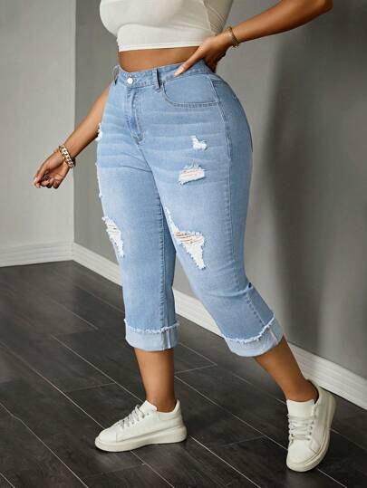 SHEIN SXY Jeans casuales de talla grande con dobladillo crudo y puños - Lavado ligero - Añade 1