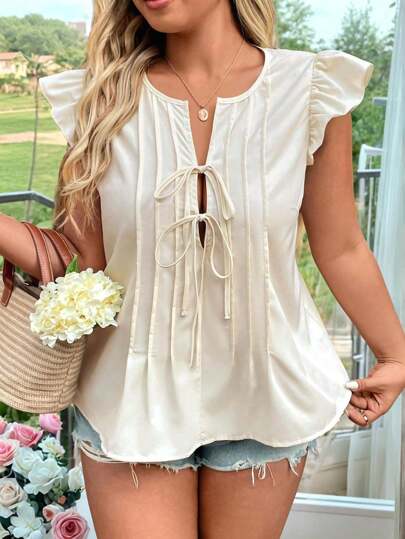 SHEIN Clasi Blusa suelta con cuello redondo, manga de casquete y lazo en talla grande - Albaricoque - Añade 1