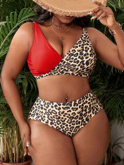 SHEIN Swim Curve Conjunto de bikini de talla grande con Top triangular de estampado de leopardo y Bottom de cintura alta - Multicolor - Añade 4
