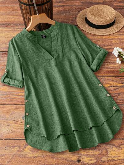 SHEIN CURVE+ Camisa casual de manga corta con cuello en V de unicolor, adecuada para el verano, talla grande - Verde - Añade 4