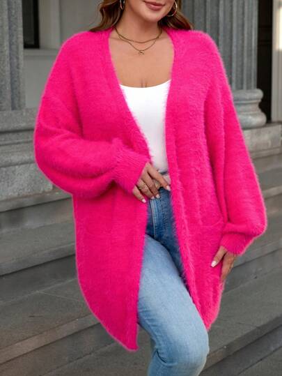 SHEIN LUNE Suéter tipo cardigan de manga larga, de unicolor y versátil casual, para invierno, talla grande - Rosa Fucsia - Añade 3