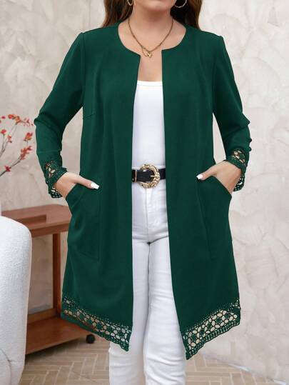 SHEIN Clasi Abrigo informal abierto de manga larga, de unicolor, con bolsillo hueco, para tallas grandes - Verde Oscuro - Añade 5