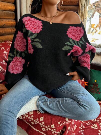 Calvaya Suéter informal de manga larga con estampado floral, para invierno, de punto, para otoño, talla grande - Multicolor - Añade 1