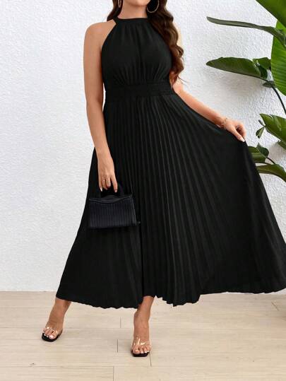 Flirla Vestido largo de mujer con cuello de halter, tela plisada y unicolor para tallas grandes - Negro - Añade 3