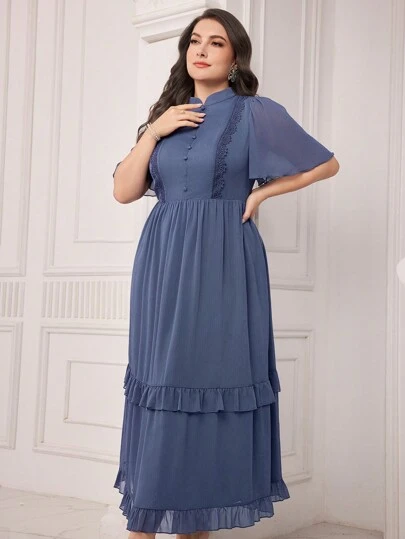 Modelyn Vestido de talla grande de unicolor con cuello alto, contraste de encaje, mangas de volantes y dobladillo con volantes, vestido de invitada de boda, vestidos largos de noche - Azul - Añade 1