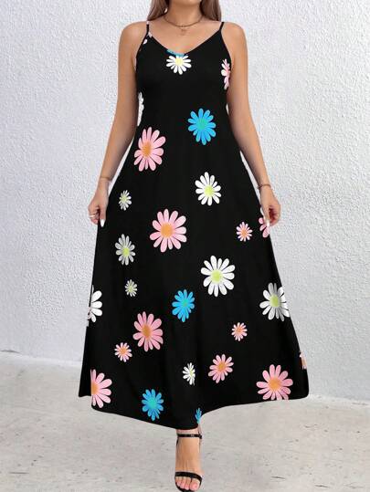 SHEIN LUNE Vestido casual con tirantes spaguetti de talla grande y estampado floral para verano - Negro - Añade 5