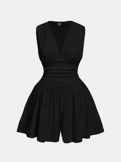 SHEIN MOD Mono negro de talla grande con cuello en V, cintura entallada y piernas anchas - Negro - Añade 4
