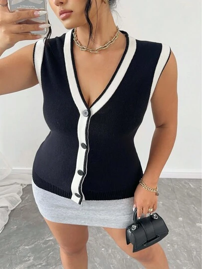 Flirla Chaleco de punto de estilo francés sencillo y casual para mujer talla grande - Multicolor - Añade 1