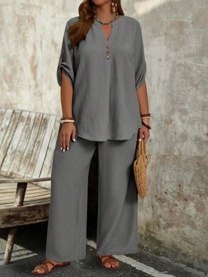 EMERY ROSE Conjunto informal de 2 piezas (camisa y pantalones) de unicolor, cuello en muesca, manga enrollada, para vacaciones, talla grande - Gris - Añade 1