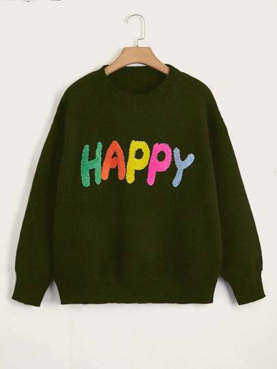 Flirla Suéter de punto con cuello redondo, manga de toalla y estampado de letras coloridas para mujer de talla grande, para otoño e invierno - Verde militar - Añade 3