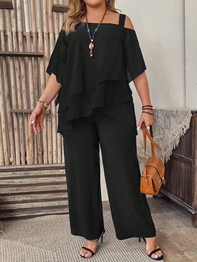 Momelise Conjunto de 2 piezas de Mujer Talla Grande con parte superior de hombro asimétrico y puño de malla lisa con pantalones - Negro - Añade 5