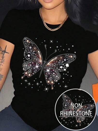SHEIN CURVE+ Camiseta casual de mujer de talla grande con cuello redondo, manga corta y estampado de mariposas con rhinestones - Negro - Añade 1