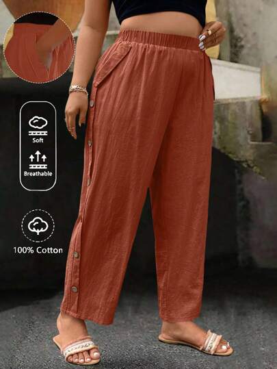 Breezaya Pantalones casuales de pierna ancha de unicolor con cintura elástica y decoración de botones para mujer talla grande - Marrón - Añade 4