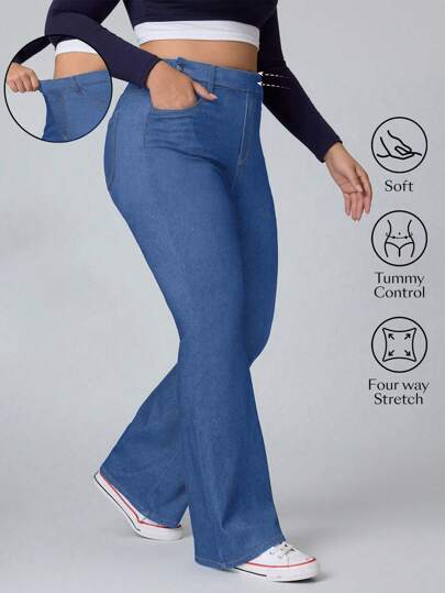 SHEIN Essnce Jeans de pierna acampanada de talla grande de mezclilla azul elástica para mujeres - Azul - Añade 1