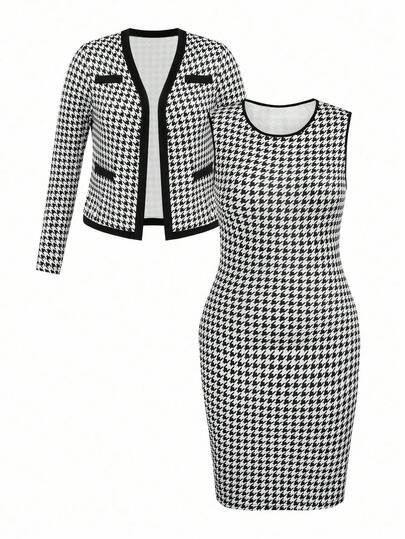 EMERY ROSE Conjunto casual de vestido sin mangas de mujer de tallas grandes con bloques de color + Chaqueta de punto de manga larga para primavera y otoño - Blanco y Negro - Añade 3