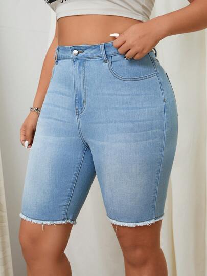 SHEIN EZwear Shorts vaqueros de tallas grandes para mujeres con bolsillos y dobladillo deshilachado - Lavado ligero - Añade 1
