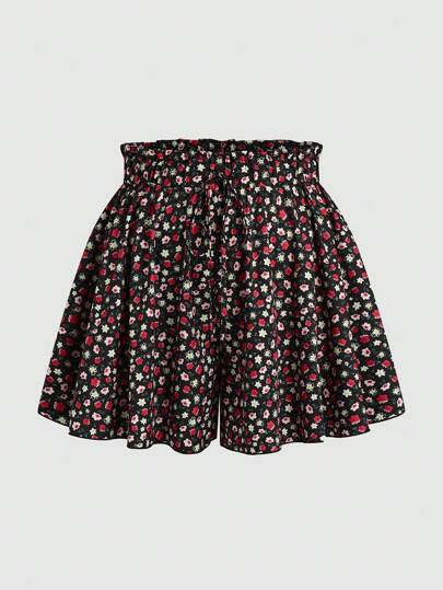 Flirla Pantalones cortos con cordón en la cintura y estampado floral pequeño para mujeres de talla grande, ideales para el verano - Multicolor - Añade 1