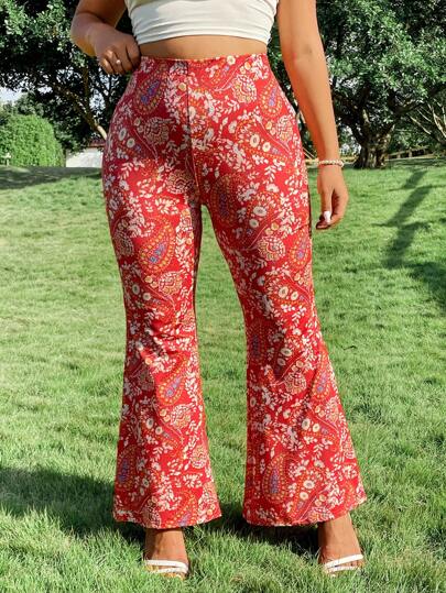 SHEIN Clasi Pantalones de punto de talla grande para mujer con cintura alta y pierna campana con estampado retro - Color caoba - Añade 5