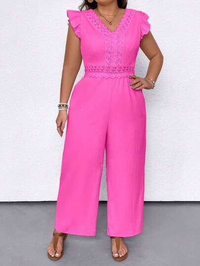 SHEIN LUNE Jumpsuits elegantes de manga de tapeta y escote en V con encaje de contraste para mujeres de tallas grandes - Rosa Fucsia - Añade 2