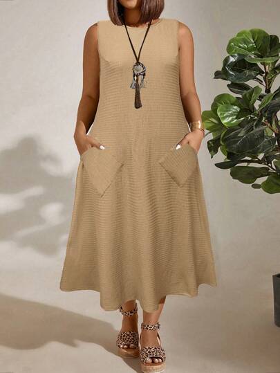 EMERY ROSE Vestido casual largo de tela texturizada sin mangas con hombros abiertos y bolsillos para mujer talla grande - Caqui - Añade 1
