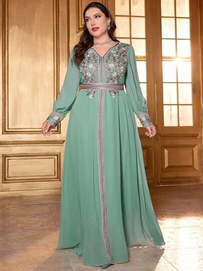 Vestido largo de manga larga con escote entallado, bordado floral elegante, para mujer tallas grandes, estilo kaftan, para primavera y verano - verde menta - Añade 1