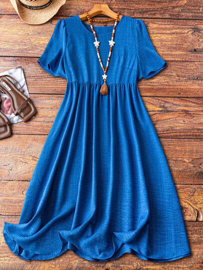 SHEIN LUNE Vestido de talla grande para mujer de manga corta, cuello redondo, de largo medio, con estampado, para verano - Azul - Añade 5