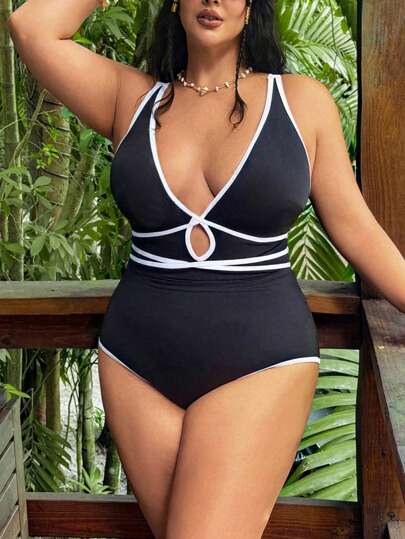 SHEIN Swim Curve Traje de baño de una pieza con escote en V y cordones, para tallas grandes de mujer - Negro - Añade 6
