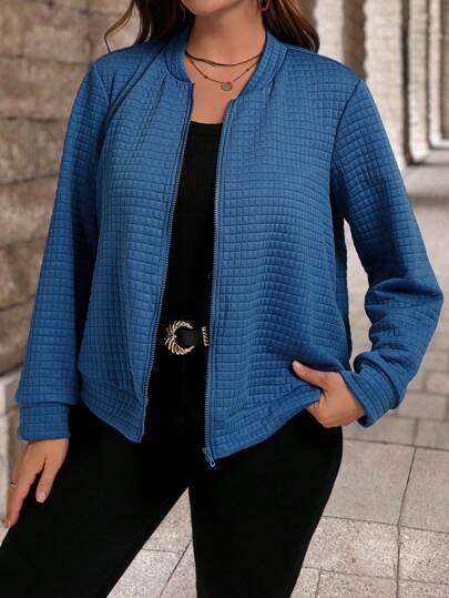 SHEIN LUNE Chaqueta casual de trabajo con cremallera y estampado de cuadros azules para mujer de talla grande, para otoño/invierno - Azul - Añade 1