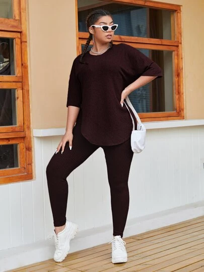 SHEIN EZwear Leggings con top unicolor de hombros caídos tejido waffle - Marrón Chocolate - Añade 4