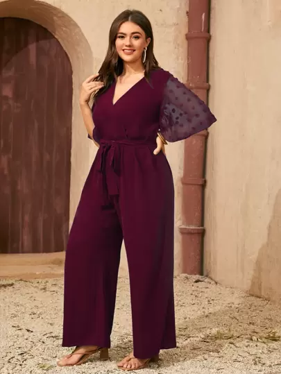 SHEIN Clasi Mono de pierna ancha con mangas tipo mariposa, con cinturón y lunares, de talla grande - Burdeos - Añade 4