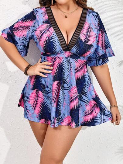 SHEIN Swim Curve Tankini de verano para playa con estampado tropical, contraste de malla y volantes en las mangas para tallas grandes - Multicolor - Añade 1