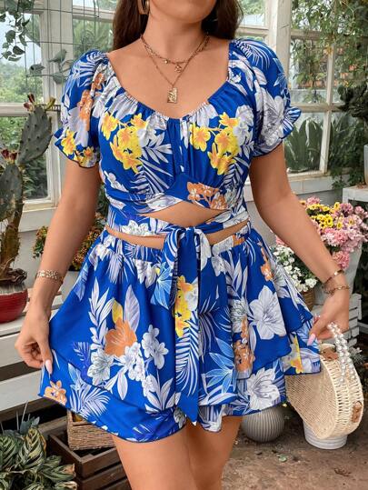 Sunnyshic Talla grande con estampado tropical con cordón delantero Top crop & Shorts - Celeste - Añade 1