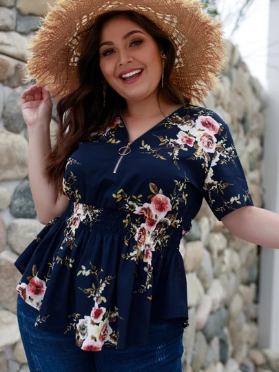 SHEIN LUNE Blusa fruncido con estampado floral con cremallera-grande - Multicolor - Añade 6