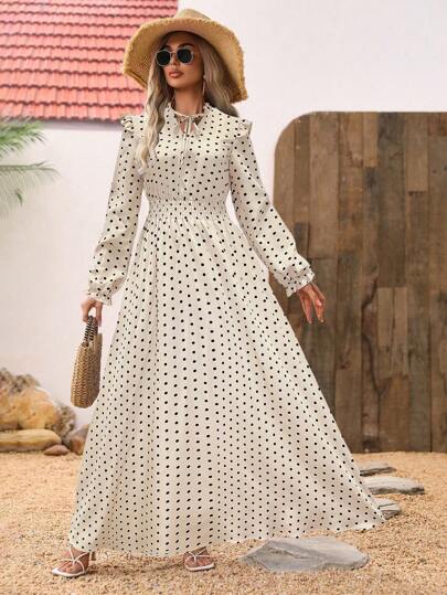 SHEIN Clasi Vestido largo de lunares con volantes y mangas acampanadas para el verano y vacaciones, vestimenta de mujer - Albaricoque - Añade 1
