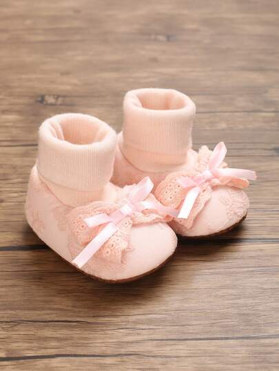 Calcetines de bebé de 0 a 1 año con suela blanda, antideslizantes, de estilo princesa con decoración de lazo para niñas de primavera - Rosa - Añade 1