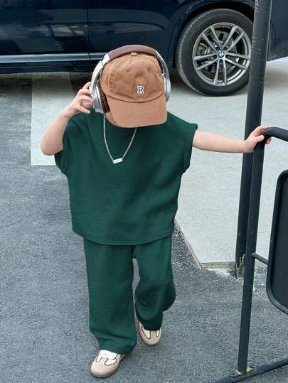 SHEIN Leap Crew Conjunto de 2 piezas para niños y niños jóvenes: camiseta holgada de punto floral y rayas en la axila, y pantalones holgados, en estilo japonés y coreano informal, adecuado para la escuela, deportes, vacaciones, hogar y exterior, apto para primavera y verano - Verde Oscuro - Añade 1