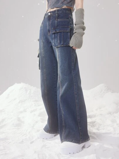 ROMWE Fairycore Jeans de pierna amplia con bolsillo con solapa - Azul lavado oscuro - Añade 1