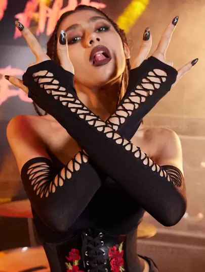 ROMWE Grunge Punk Guantes sin dedos largos calados y sólidos para boda - Negro - Añade 1