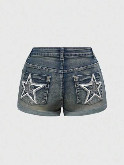 ROMWE Grunge Punk Pantalones cortos de mezclilla con espalda abierta y bordado de estrellas, estética Y2K - Multicolor - Añade 4