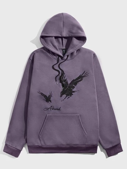 ROMWE MEN Hombres Capucha térmica con estampado de águila con bolsillo de canguro con cordón - Morado - Añade 1