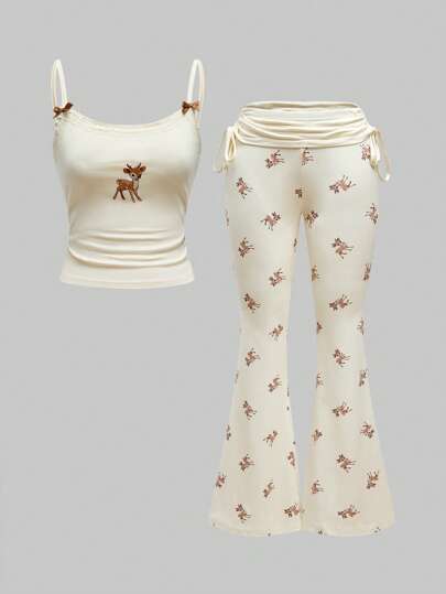 ROMWE J-Fashion Conjunto de blusa bordada con encaje con estampado de ciervos y pantalones acampanados con estampado de ciervos - Albaricoque - Añade 7