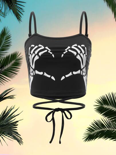 ROMWE PUNK Top de tirantes corto estampado de cráneo con cordón trasero - Negro - Añade 1