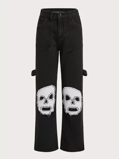 ROMWE Jeans de pierna recta con estampado de cráneo - Negro - Añade 3