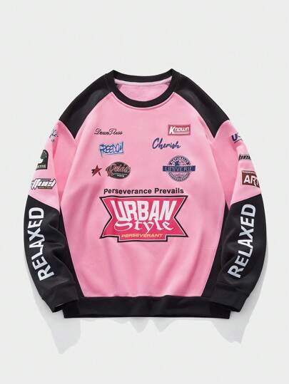 ROMWE MEN Street Life 1 pieza Sudadera de hombre con estampado de eslogan y patchwork en estilo de carreras - Rosa - Añade 1